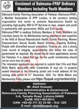Rahnuma Family Planning Association Lahore, lahore Punjab Pakistan invites applications from eligible candidates for the post of member as per advertisement of December 17, 2023 published in daily Jang Newspaper. Bachelor, Master and MS etc. educational qualification will be preferred.