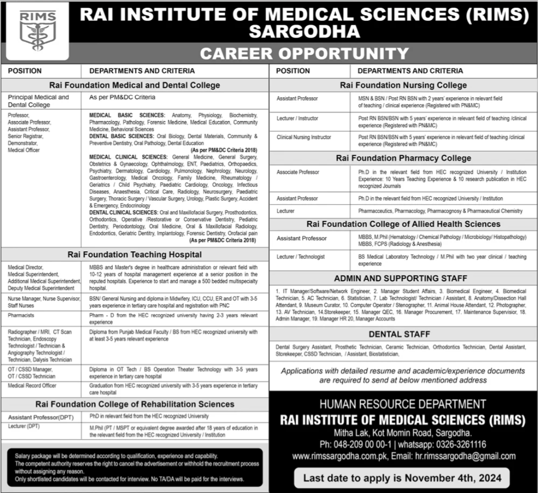 Vacant posts including demonstrator, medical officer, professor, lecturer, registrar, medical superindendent, nurse manager, staff nurse, associate professor, medical director, assistant professor and nurse supervisor are announced in Rai Institute of Medical Sciences RIMS Sargodha, sargodha Punjab Pakistan as per 20 October 2024 advertisement in daily Jang Newspaper. Educational qualifications required Phd, MS, Mphil, MBBS, BDS and Master etc.