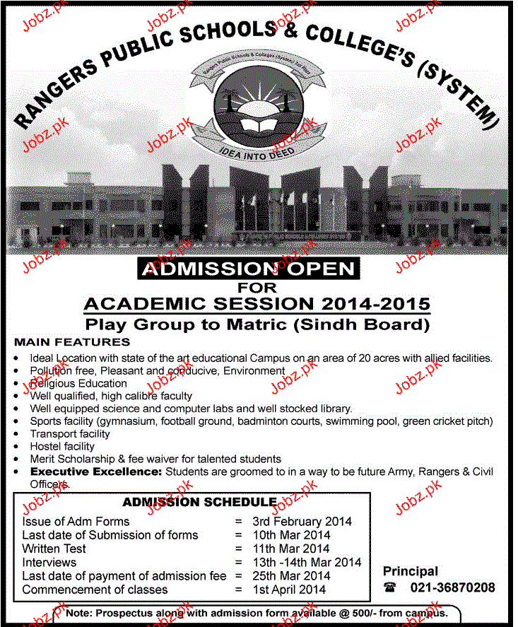 Ranger Public Schools & College System Admission in Playgroup to Matric in Lahore Read newspaper ad for exact details.