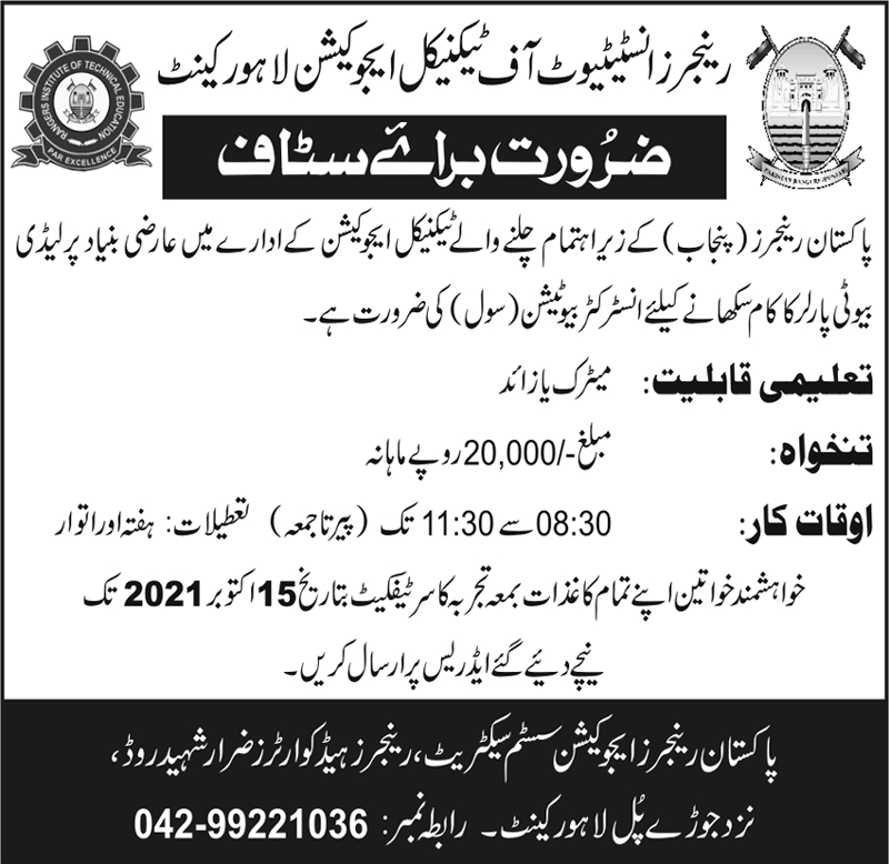 Vacancies in Rangers Institute of Technical Education Advertisement October 2021