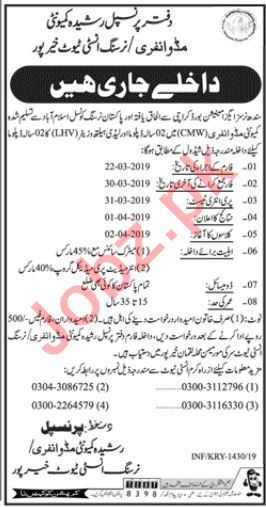 Rasheeda Community Midwifery Nursing Institute has announced Admissio9n for Community Midwifery CMW, Lady health Visitor LHV in Khairpur. Last date of Submission of Admission form is March 30th 2019 Read newspaper ad for exact details.