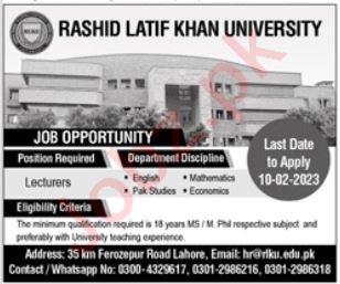 Rashid Latif Khan University invites applications for job positions advertised in daily Jang dated 29 January 2023 for following vacancies in Lahore, lahore Punjab Pakistan.