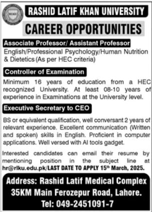 Rashid Latif Khan University invites applications for job positions advertised in daily Jang dated 2 March 2025 for following vacancies in Ferozepur Road Lahore, lahore Punjab Pakistan.
