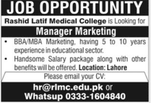 Rashid Latif Medical College Manager Marketing Jobs 2022