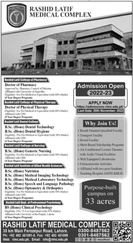Rashid Latif Medical Complex RLMC admissions 2022 for Pharm D, Doctor of Pharmacy, Doctor of Physical Therapy, DPT has been announced. Students who want to take admissions in Rashid Latif Medical Complex RLMC Lahore Punjab Pakistan for academic year 2022 to continue education in Medical Medical College can apply. Students who want to enroll for academic session 2022 in Pharm D and DPT qualification and admission criteria for Private institute can apply till last date 16 November 2022. Read newspaper ad for exact details.