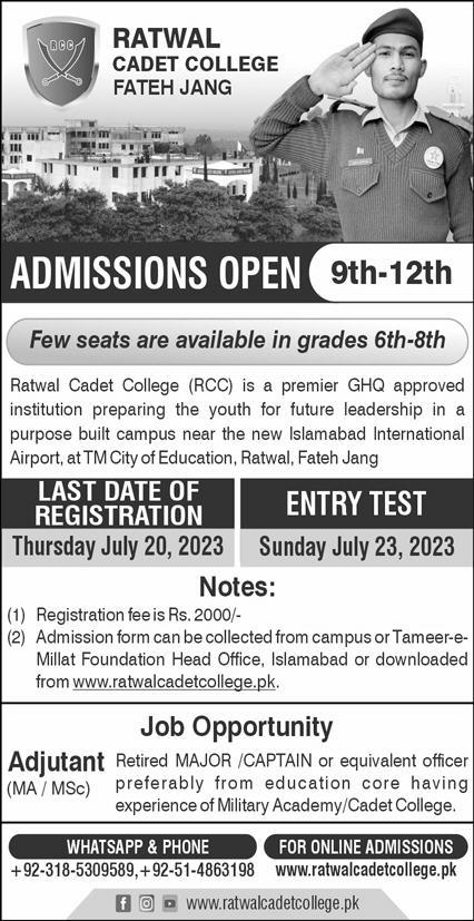 Ratwal Cadet College admissions 2023 for 6th to 8th Class, 9th Class, 10th Class, 11th Class, 12th Class has been announced. Ratwal Cadet College Fateh Jang Punjab Pakistan welcomes students to apply for admissions in academic year 2023 in Science College. Students for admissions in Matric, Intermediate and Middle & criteria can apply as per Private institute admission policy 2023 before closing date July 20, 2023 as per advertisement. Read newspaper ad for exact details.