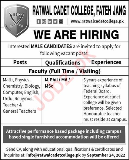 Ratwal Cadet College jobs advertisement dated about 18 September 2022 in daily Express Newspaper invites application for the vacant post of math teacher, computer teacher, english teacher, biology teacher, chemistry teacher, general teacher, religious teacher, physics teacher and urdu teacher in Fateh Jang, fateh jang Punjab Pakistan. Candidates with MS, Bachelor, Mphil and Master etc. educational background will be preferred.