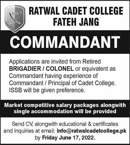 Vacant posts including commandant are announced in Ratwal Cadet College Fateh Jang, fateh jang Punjab Pakistan as per 5 June 2022 advertisement in daily Express Newspaper. Preferred Education is Intermediate and Bachelor etc.