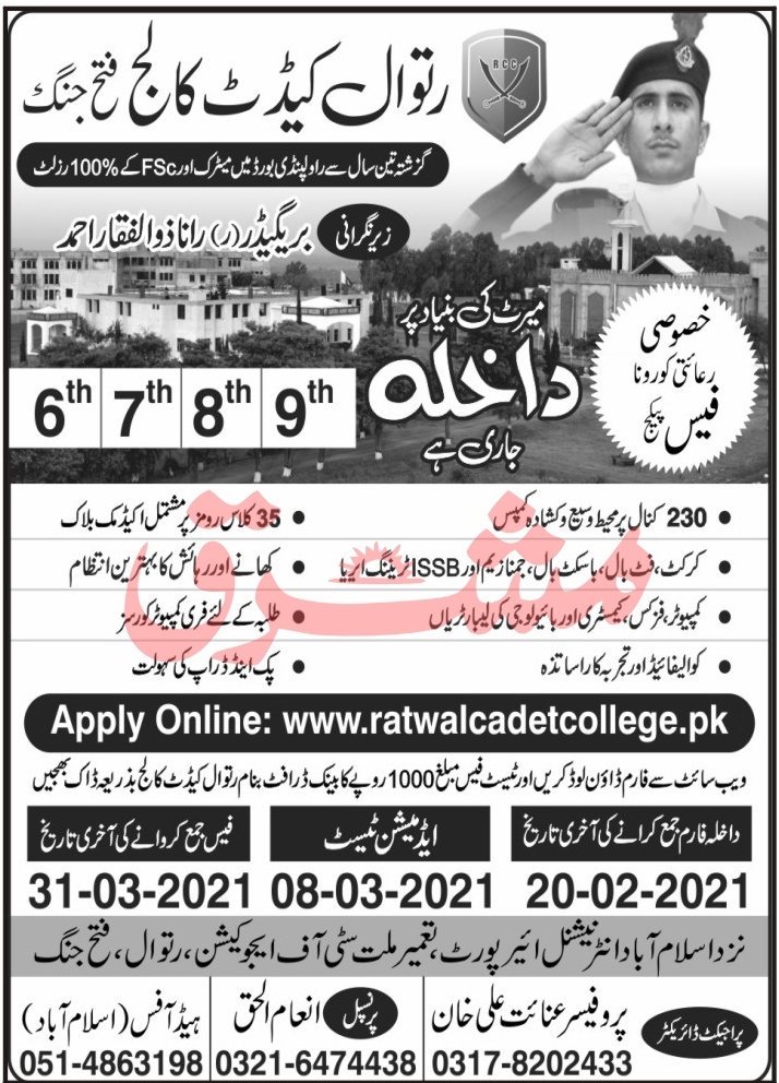 Pakistan Army Ratwal Cadet College invited applications for admissions in Class 6th, Class 7th, Class 8th and Class 9th in Fateh Jhang Punjab Pakistan 2021. Read newspaper ad for exact details.