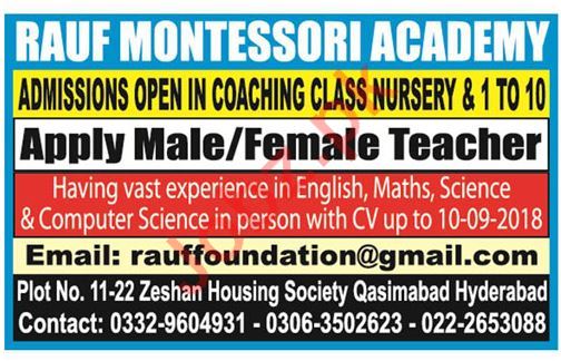 Rauf Montessori Academy Hyderabad Jobs 2018 for Teachers