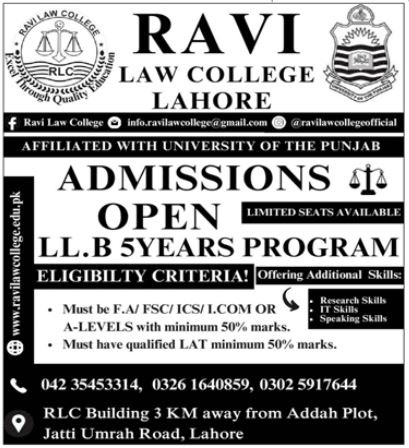 Ravi Law College admissions 2023 for LL.B has been announced. Ravi Law College Lahore Punjab Pakistan welcomes students to apply for admissions in academic year 2023 in Other University. Students who want to enroll for academic session 2023 in LLb qualification and admission criteria for Private institute can apply till last date 27 January 2024. Read newspaper ad for exact details.