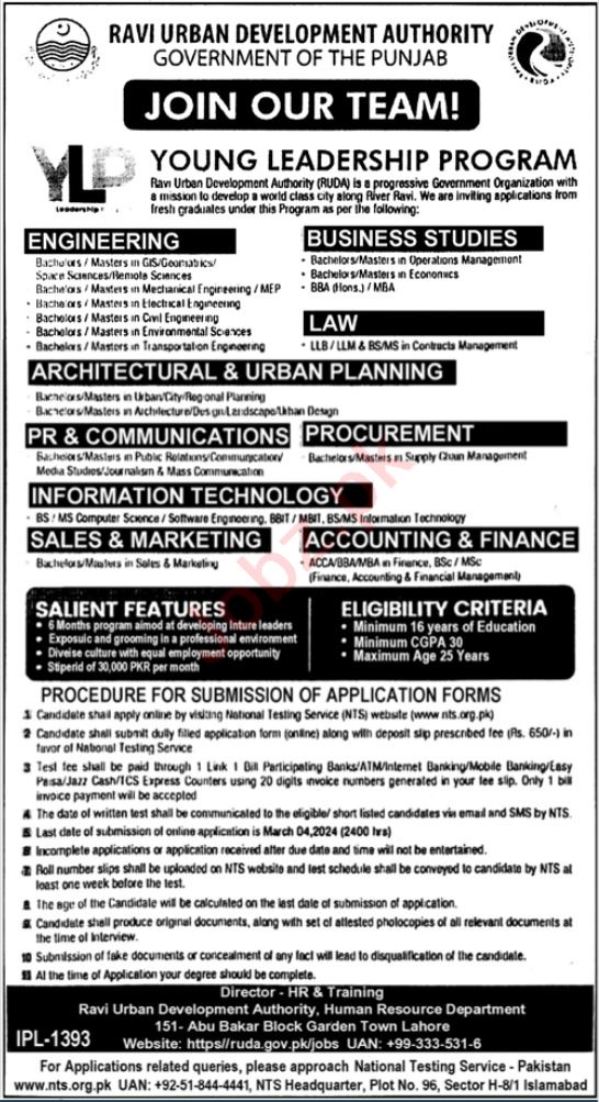 Ravi Urban Development Authority RUDA Lahore, lahore Punjab Pakistan invites applications from eligible candidates for the post of young leadership program as per advertisement of February 19, 2024 published in daily Jang Newspaper. Persons with Master, MS, MBA, BBA and Bachelor etc. education can apply.