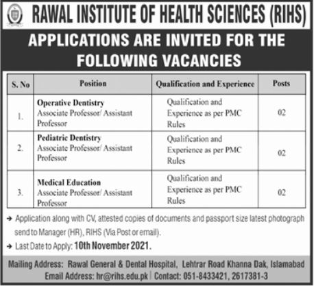 Vacancies in Rawal Institute of Health Sciences Advertisement October 2021