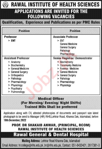 Rawal Institute of Health Sciences Islamabad, islamabad Islamabad Pakistan invites applications from eligible candidates for the post of associate professor general surgery, registrar forensic medicine, associate pharmacy, medical officer, assistant professor pathology, assistant professor anatomy, registrar community medicine, assistant professor biochemistry, assistant professor general medicine, registrar pathology, assistant professor pharmacology, associate pathology, associate professor ent, assistant professor orthopedics, professor ent, assistant professor psychiatry, registrar biochemistry and assistant professor psychology as per advertisement of December 5, 2022 published in daily Ausaf Newspaper. Educational qualifications required Master, MBBS, Phd and Mphil etc.