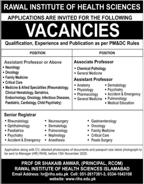 Rawal Institute of Health Sciences jobs advertisement dated about 5 November 2025 in daily Jang Newspaper invites application for the vacant post of registrar, assistant professor and associate professor in Islamabad, islamabad Islamabad Pakistan. Mphil, Bachelor, Master, Phd and MBBS etc. educational qualification will be preferred.