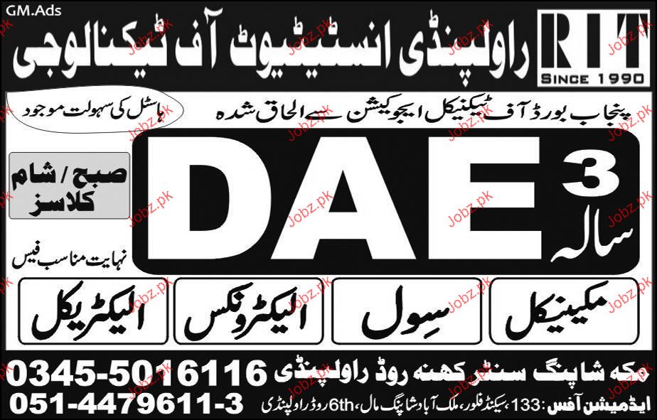Rawalpindi Institute of Technology Admission in DAE in Rawalpindi. Read newspaper ad for exact details.