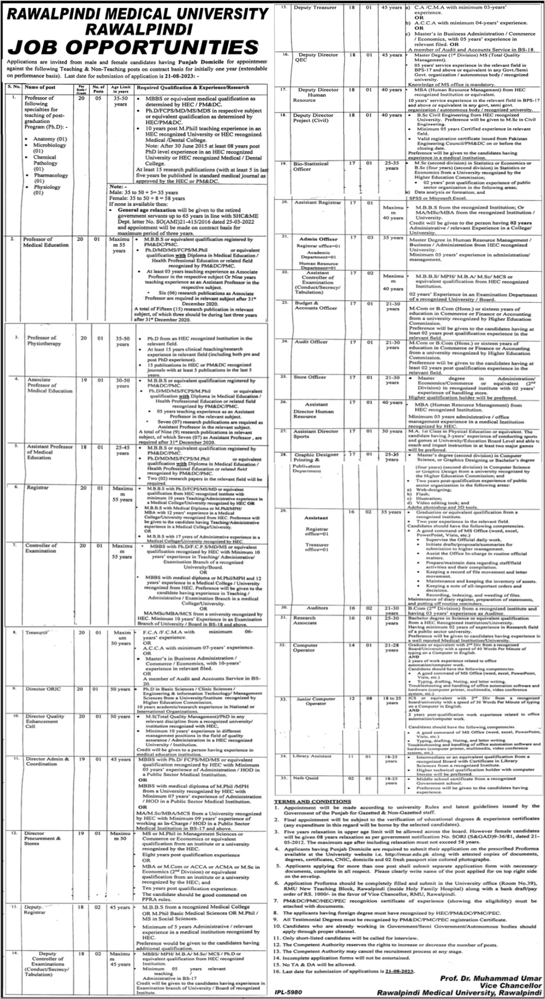 Vacant posts including admin officer, director admin, library assistant, assistant professor, budget officer, audit officer, director qec, assistant registrar, deputy director project, registrar, controller of examination, deputy director project civil, assistant director sports, research associate, deputy treasurer, store officer, auditor, accounts officer, biostatistical officer, computer operator, treasurer, director quality enhancement cell, director coordination, deputy registrar, deputy controller of examination, director oric, director procurement, assistant controller of examination, deputy director human resource, associate professor, deputy director qec, assistant director human resource, director stores, assistant, professor, graphic designer and naib qasid are announced in Rawalpindi Medical University RMU Rawalpindi, rawalpindi Punjab Pakistan as per 29 July 2023 advertisement in daily Jang Newspaper. Persons with M.sc, MBA, BA, Bachelor, ACCA, MCS, Middle, MBBS, Intermediate, MA, DAE, B.com, M.com, Others, Master, Phd, Mphil, CA and P.G Diploma etc. education can apply.