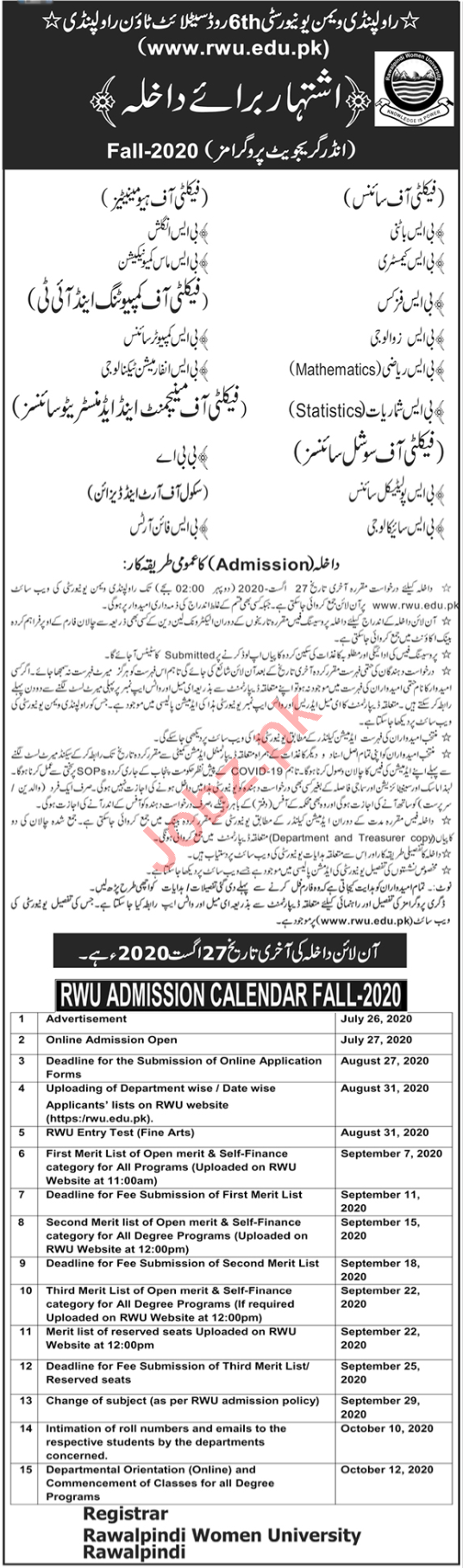 Rawalpindi Women University RWU, Pakistan is starting admissions fall 2020 for the classes of BS Botany, Chemistry, Physics, Zoology, Maths, Statistics, Computer Science and Information Technology. Read newspaper ad for exact details.