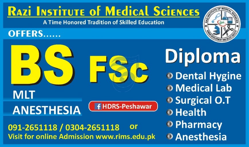 Razi Institute of Medical Sciences RIMS Peshawar, Pakistan is opening admissions fall 2020 for the classes of BS MLT, FSc, Diploma in Dental Hygine, Medical Lab and Surgical OT. Read newspaper ad for exact details.