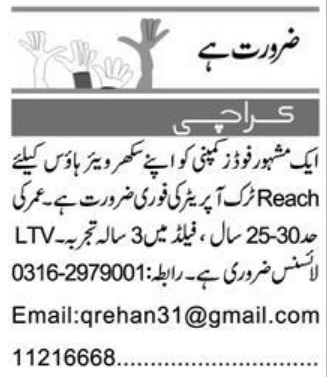 Private Company Sukkur, karachi Sindh Pakistan invites applications from eligible candidates for the post of driver, htv driver, truck driver and reach truck operator as per advertisement of April 22, 2022 published in daily Express Newspaper. Matric and Intermediate etc. educational qualification will be preferred.