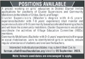 Read Foundation NGO jobs advertisement dated about 31 August 2023 in daily K2 Newspaper invites application for the vacant post of community mobilizer and cluster supervisor in Diamer, diamer Gilgit Baltistan Pakistan. Persons with Master and Bachelor etc. education can apply.