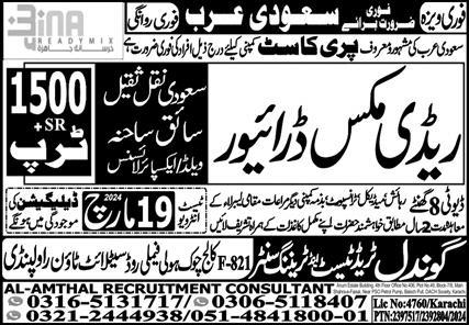 Gondal Trade Test & Training Center jobs advertisement dated about 16 March 2024 in daily Express Newspaper invites application for the vacant post of ready mix driver and driver in Jeddah, makkah Saudi Arabia. Candidates with Matric and Intermediate etc. educational background will be preferred.