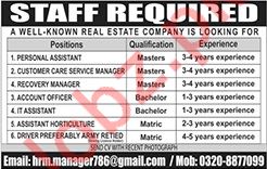 A well known private company invites applications from experienced, hardworking and target oriented candidates for the posts of Personal Assistant, Customer Care Service Manager, Recovery Manager, Account Officer, IT Assistant, Assistant Horticulture, Driver in Lahore.