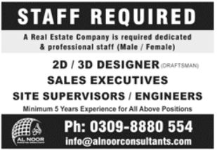 Real Estate Company is looking for candidates for following posts as per job advertisement published in daily Jang Newspaper of May 22, 2022 for location Lahore, lahore Punjab Pakistan:
