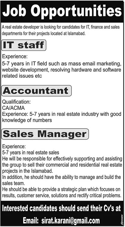 Real Estate Company is looking for candidates for following posts as per job advertisement published in daily The News Newspaper of May 8, 2022 for location Islamabad, rawalpindi Islamabad Pakistan: