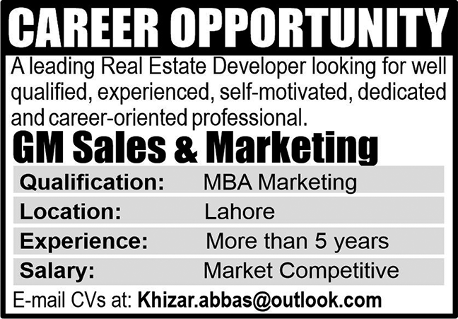 Real Estate Developers invites applications for job positions advertised in daily Nawaiwaqt dated 30 October 2025 for following vacancies in Lahore, lahore Punjab Pakistan.