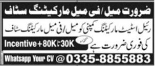 Real Estate Company invites applications for job positions advertised in daily Jang dated 3 July 2022 for following vacancies in Rawalpindi, islamabad Punjab Pakistan.