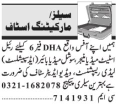 Real Estate Company jobs advertisement dated about 11 January 2024 in daily Jang Newspaper invites application for the vacant post of video editor, social media manager, real estate media manager, social media buyer, lady receptionist, receptionist and aid specialist in Lahore, lahore Punjab Pakistan. Persons with Intermediate, Bachelor, Matric and BA etc. education can apply.