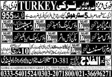 Global Al Saqib Recruitment Group jobs advertisement dated about 9 March 2024 in daily Express Newspaper invites application for the vacant post of female receptionist, housekeeping area cleaner, house keeping room maid, waiters assistant, house maid, bar man, kitchen dish washer and bar maid in Ankara, ankara Turkey. Preferred Education is Intermediate, Matric and Middle etc.