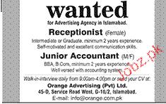 Receptionist and Junior Accountant are required in Orange Advertising Pvt Ltd in islamabad