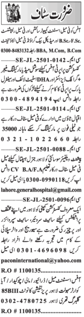 Private Company invites applications for job positions advertised in daily Jang dated 4 January 2025 for following vacancies in Lahore, lahore Punjab Pakistan.