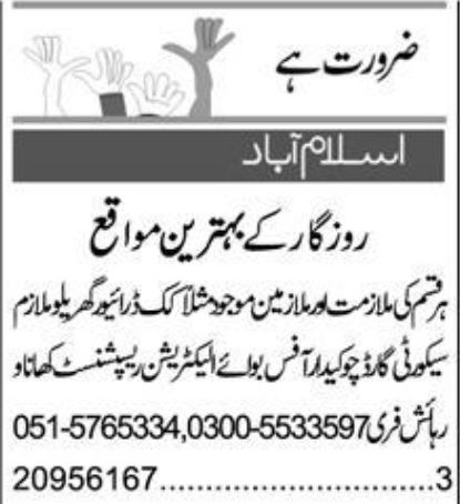 Private Company Islamabad, islamabad Islamabad Pakistan invites applications from eligible candidates for the post of electrician, cook, house servant, driver, receptionist, office boy, security guard and chowkidar as per advertisement of December 24, 2024 published in daily Express Newspaper. Middle, Matric, Bachelor, BA and Intermediate etc. educational qualification will be preferred.