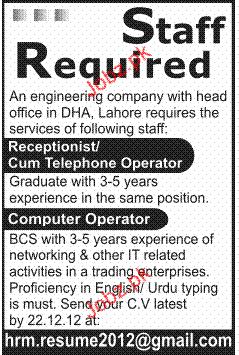 Latest Private Company Telephone Operator Posts Lahore 2025