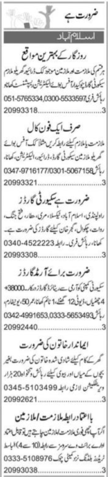 Vacant posts including driver, cook, electrician, chowkidar, aya, security guard, receptionist, masi, armed guard, husband wife, maid, watchman, house worker and office boy are announced in Private Company Committee Chowk Rawalpindi, islamabad Punjab Pakistan as per 28 November 2025 advertisement in daily Express Newspaper. Preferred Education is Matric, Middle, Intermediate and Bachelor etc.