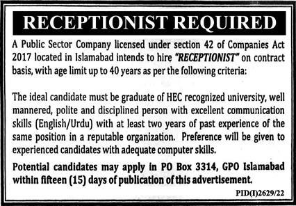 Receptionist Jobs 2022 In Public Sector Company Islamabad