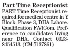 Vacant posts including receptionist are announced in Medical Center Lahore, lahore Punjab Pakistan as per 23 September 2023 advertisement in daily The News Newspaper. Preferred Education is Intermediate and I.com etc.