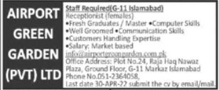 Airport Green Garden PVT LTD Islamabad, islamabad Islamabad Pakistan invites applications from eligible candidates for the post of female receptionist as per advertisement of April 19, 2022 published in daily Jang Newspaper. Persons with Master and Bachelor etc. education can apply.