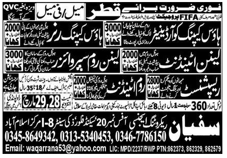 Sufyan Recruiting Agency jobs advertisement dated about 28 March 2022 in daily Express Newspaper invites application for the vacant post of housekeeping runner, linen attendant, receptionist, linen room supervisor, room attendant and housekeepeing coordinator in Qatar, qatar Qatar. Preferred Education is Bachelor, Matric, Intermediate and Master etc.