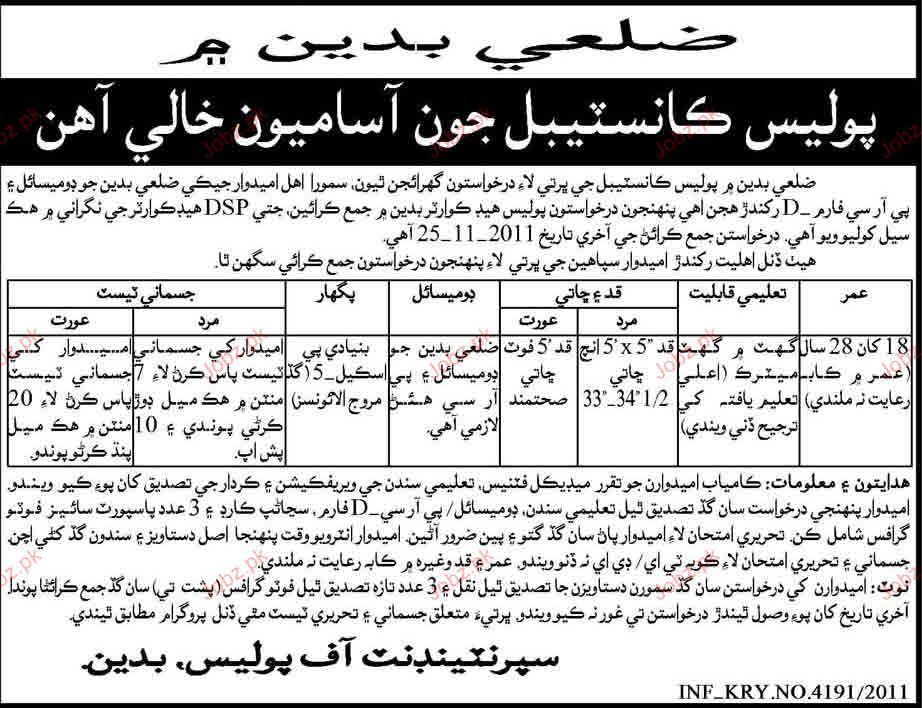 Latest Sindh Police Other Posts Badin 2025