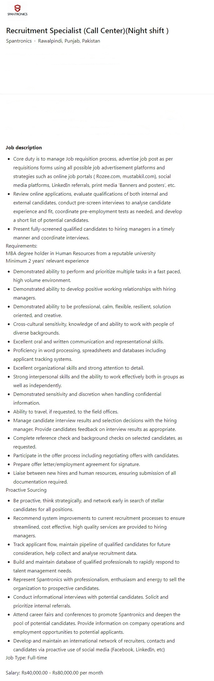Recruitment Specialist Job At Spantronics In Rawalpindi