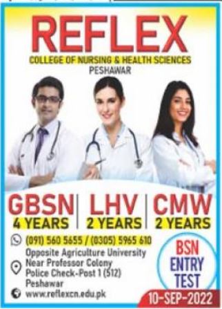 Reflex College of Nursing has announced admissions 2022 for GBSN 4 Years, LHV 2 Years, CMW 2 Years. BSN Entry Test.. Eligible students who qualify as per admission criteria in Reflex College of Nursing Peshawar Khyber Pakhtunkhwa KPK Pakistan can apply in Medical Nursing for academic year 2022. Eligible candidates for admissions in BSN can apply as per Private institute criteria and before closing date 10 September 2022 after reading advertisement online. Read newspaper ad for exact details.