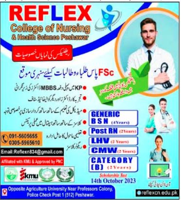 Reflex College of Nursing admissions 2023 for BSN Generic, Post RN BSN, Diploma in LHV, Lady Health Visitor Diploma, Diploma in Community Midwifery CMW, B Catagory, B Pharmacy has been announced. Students who want to take admissions in Reflex College of Nursing Peshawar Khyber Pakhtunkhwa KPK Pakistan for academic year 2023 to continue education in Medical Medical College can apply. Students for admissions in BSN, Course, Diploma and B Pharmacy can apply for online or campus classes as per Private institute criteria till admission closing date November 27, 2023. Read newspaper ad for exact details.
