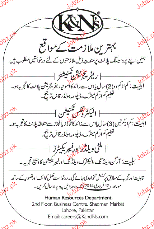 Refrigeration Technicians, Electronics Technicians and Mult Welders are required in K & Ns in Lahore