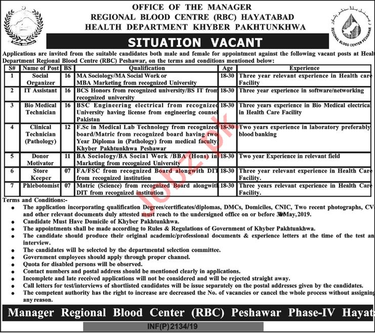 Regional Blood Centre RBC Peshawar, Hayatabad Medical Complex HMC, Health Department, Government of the KPK are seeks candidates for the posts of Social Organizer, IT Assistant, Bio Medical Technician, Clinical Technician, Clinical Technician Radiology, Donor Motivator, Store Keeper, Phlebotomist.