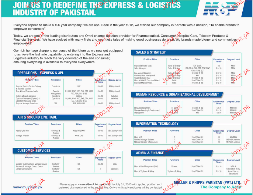 Apply as per details in job advertisement. Login to view further details of how to apply via https://www.jobz.pk online.