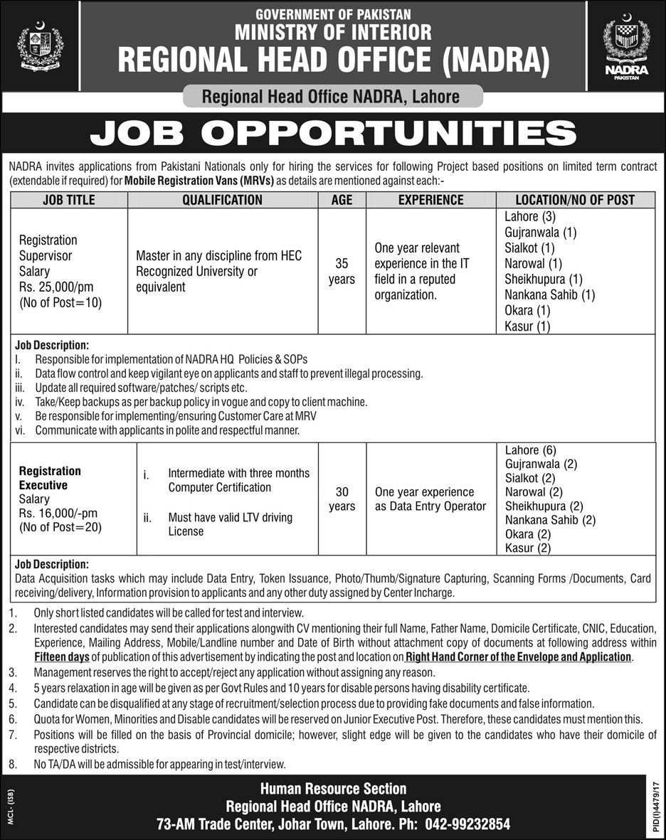 Latest National Database & Registration Authority NADRA Management Posts Lahore 2025
